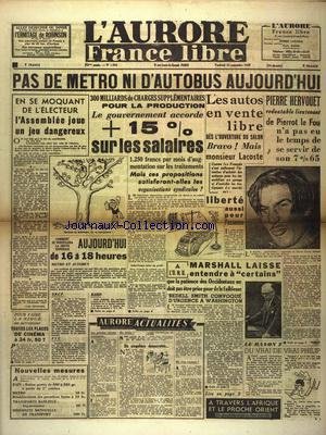 AURORE FRANCE LIBRE (L') [No 1254] du 24/09/1948 - LES CONFLITS SOCIAUX - LES GREVES - LE SALON DE L'AUTO ET LACOSTE - PIERRE HERVOUET LIEUTENANT DE PIERROT LE FOU EST SOUS LES VERROUS - MARSHALL A L'ONU - BEDELL SMITH CONVOQUE A WASHINGTON